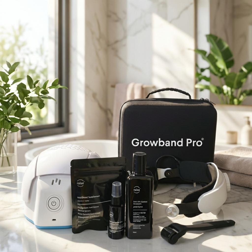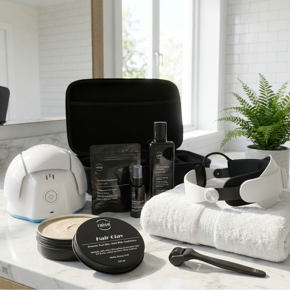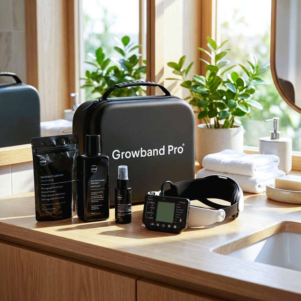 A focused program to stabilise progression and encourage visible regrowth by combining systemic support, targeted topicals, and mechanical + device stimulation.